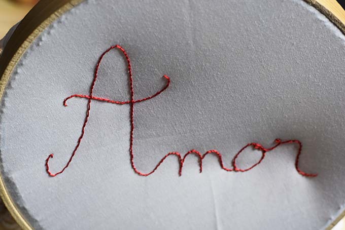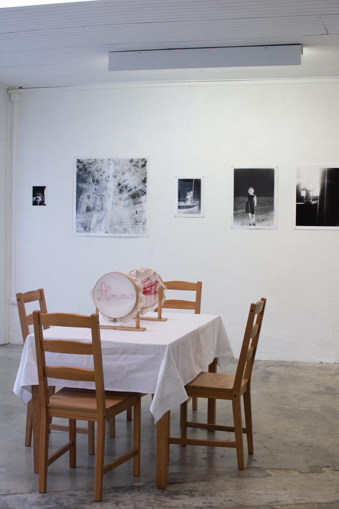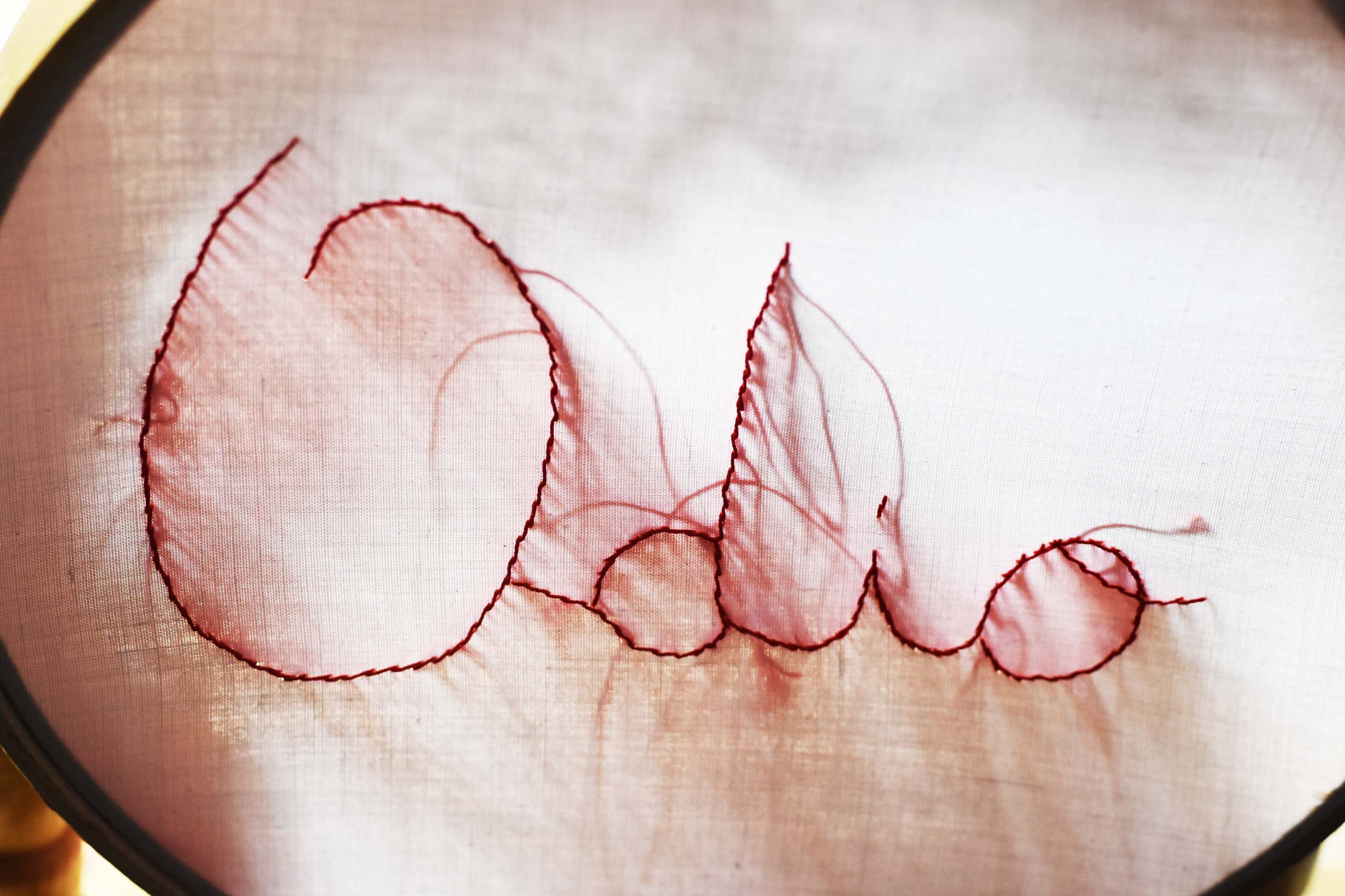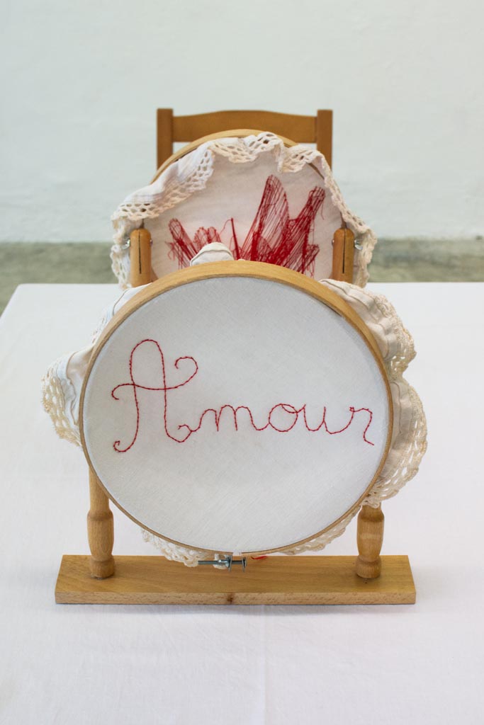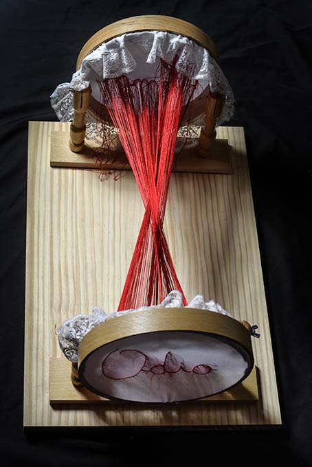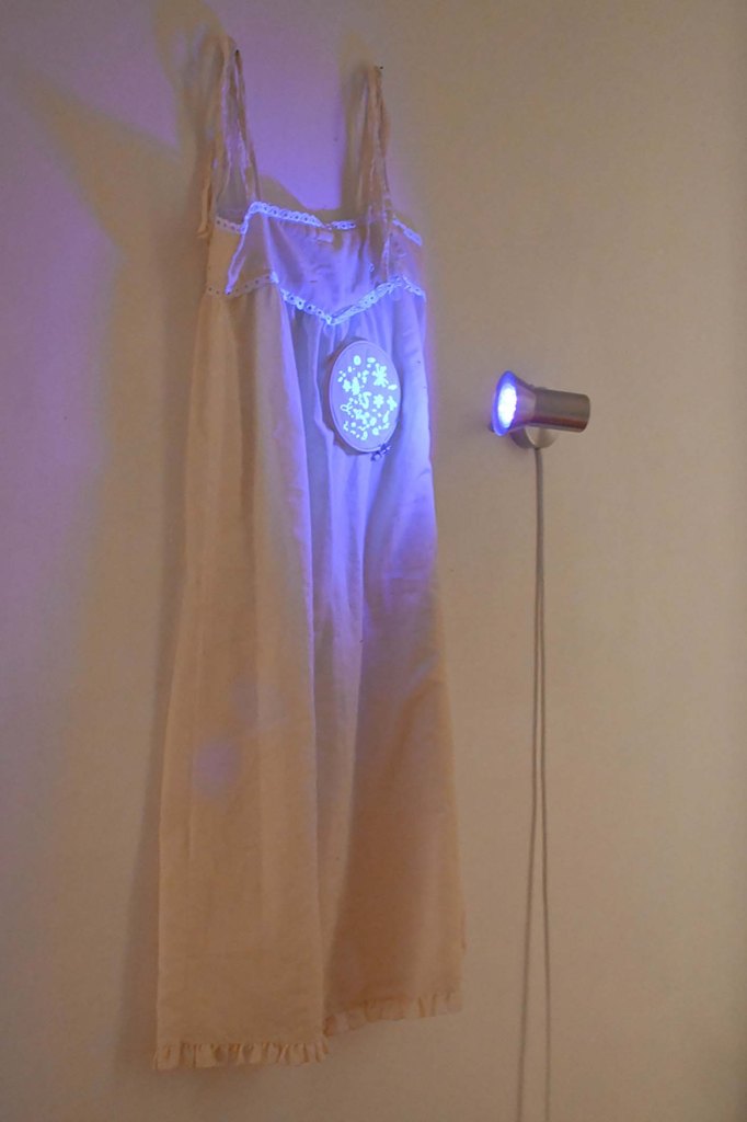 Une robe blanche, une lumière noire dirigée sur un tambour à broder oú l ́on aperçoit des