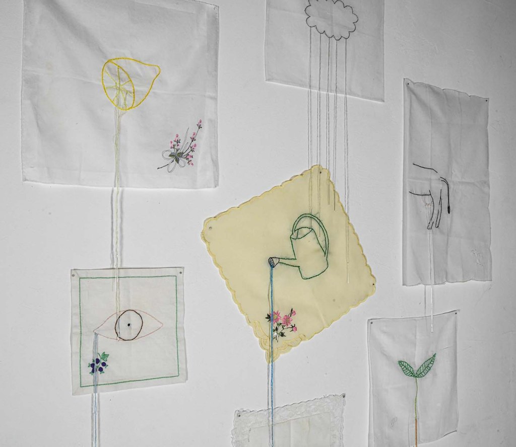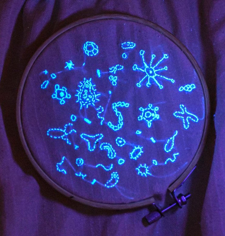 bactéries réalisées avec du fil réagissant aux UV. Cette pièce interroge la perception, des